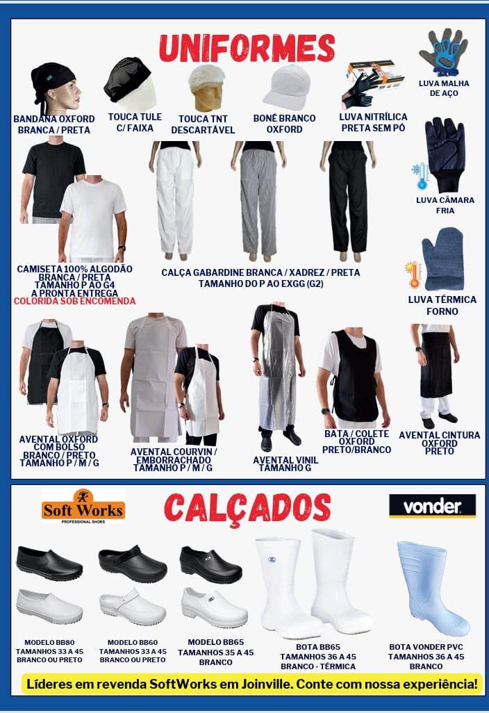 SAPATOS AVENTAIS CAMISETAS CALÇAS TENIS TAMANCOS